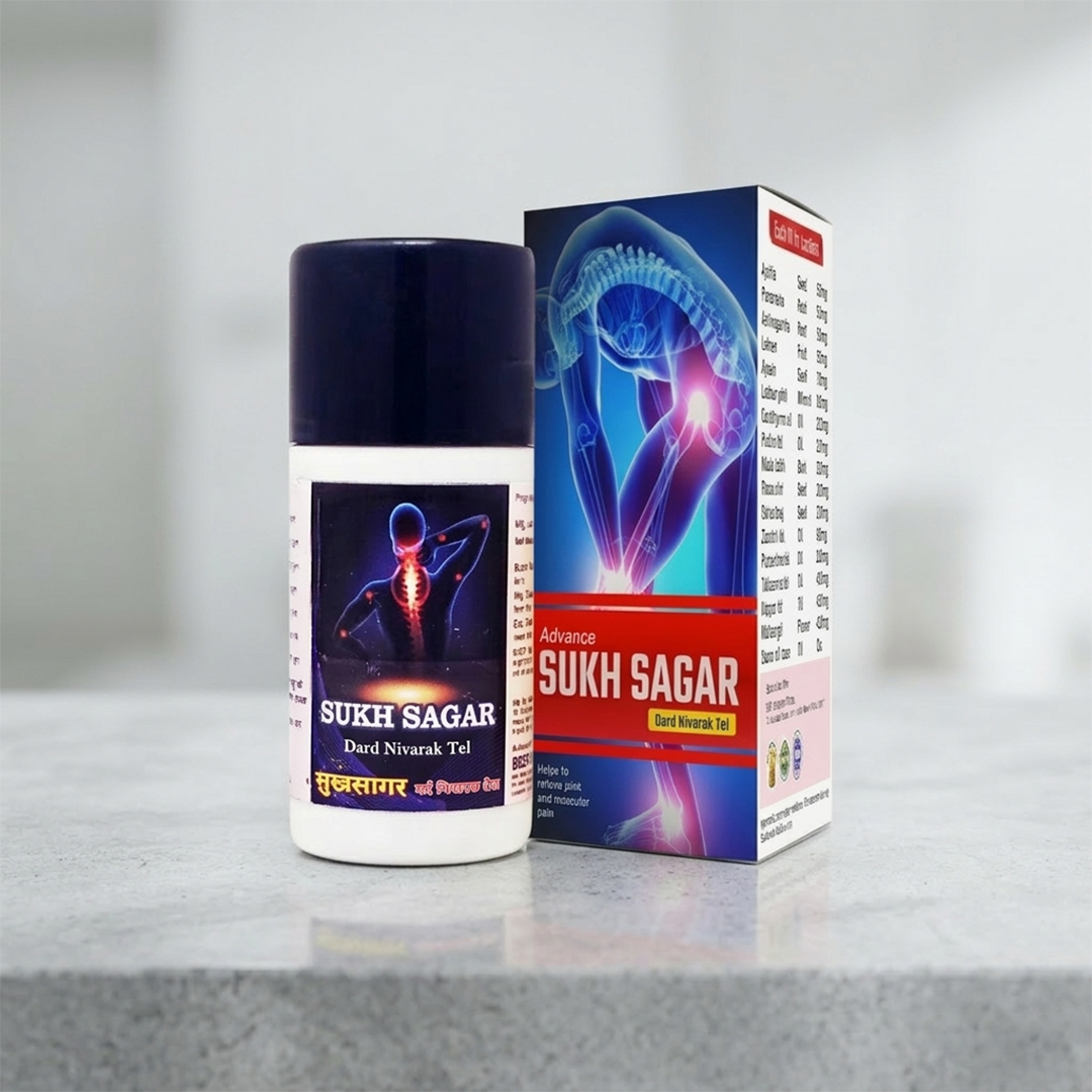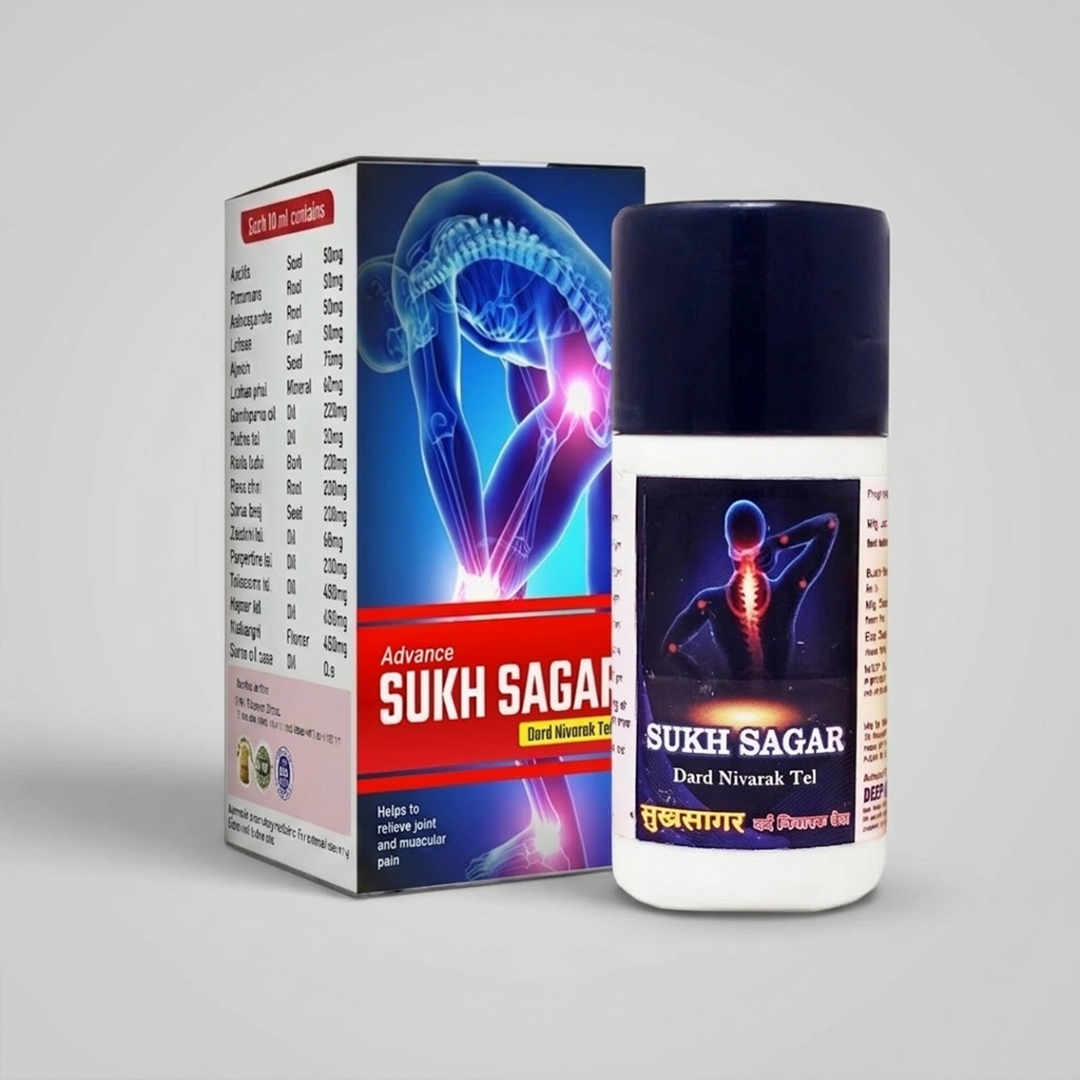 Sukh Sagar Dard Nivarak Tel is a powerful Ayurvedic pain relief oil made with a blend of natural herbal ingredients. It is specially formulated to provide fast and soothing relief from joint pain, muscle stiffness, back pain, and body aches. The oil penetrates deeply into muscles and joints, helping improve circulation and reducing discomfort naturally.